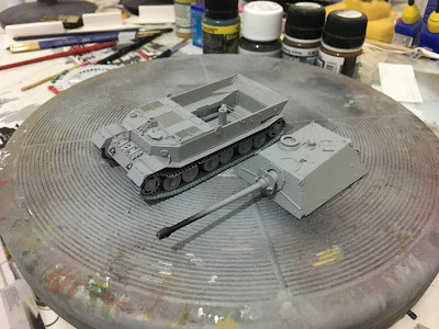 As the tank's fixed turret is a single piece, the assembly stage finished as soon as the tracks were done. To reveal any errors made during the tank's construction, I primed it. I waited for the primer to dry.
